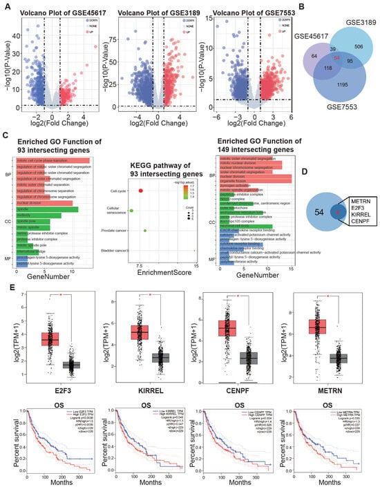 In order to find the oncogenes that facilitate melanoma’s progression, we analyzed three public GEO datasets. GSE46517 contained 104 melanoma and 17 normal skin samples, GSE3189 contained 45 melanoma and 25 normal skin samples, and GSE7553 contained 56 melanoma and 5 normal skin samples. After performing differential expression analysis, we identified 699 DEGs (275 upregulated and 424 downregulated) from GSE46517, 1918 DEGs (694 upregulated and 1224 downregulated) from GSE3189, and 2580 DEGs (1462 upregulated and 1118 downregulated) from GSE7553 (Figure 1A). In order to find key target genes that exert crucial roles in melanoma, we took an intersection of the upregulated DEGs in these datasets (Figure 1B). We also conducted GO and KEGG analyses to explore the enriched functions and pathways in melanoma. Both GO and KEGG showed that 93 intersecting genes of GSE46517 and GSE3189 were enriched in cell division and the cell cycle (Figure 1C). GO analysis of 149 intersecting genes of GSE7553 and GSE3189 showed similar results, which was consistent with the hyperproliferative property of melanoma. For further verification, we submitted the 54 central upregulated genes to GEPIA to detect the differences in gene expression levels between the tumor and normal samples and the association of these DEGs with patients’ outcomes. We found that CENPF, E2F3, KIRREL, METRN were both upregulated and associated with worse OS in melanoma patients (Figure 1D,E). Our previous study [] using scRNA-seq data revealed a subset of melanoma cells with high proliferative ability, with CENPF being the top differential gene. All of these lines of evidence indicate that CENPF may play an important role in melanoma progression.