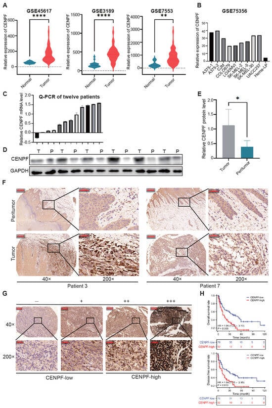 The expression of CENPF was significantly upregulated in melanoma and was associated with a worse prognosis. (A) Violin plots showing the expression of CENPF in normal samples and tumor patients in the GSE46517, GSE3189 and GSE7553 datasets. “*” indicates p < 0.05; “**” indicates p < 0.01; “****” indicates p < 0.000, and same for all figures below. (B) Bar plot showing the expression of CENPF in eight melanoma cell lines and one normal melanocyte cell line in GSE75356. (C) CENPF mRNA expression in 12 pairs of melanoma tissues shown as Log2 (T/P). T tumor, P peritumor. (D,E) CENPF protein expression in 12 pairs of melanoma tissues; representative bands are shown. (F) Representative images of the TMA stained with IHC for CENPF. (G) Representative images of tumor tissues in different staining classifications are shown and graded from “−” to “+++”. (H) Kaplan–Meier curves showing the relationship between CENPF expression and OS and DFS.