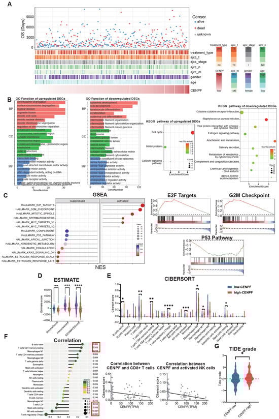 CENPF facilitates melanoma progression through promoting cell proliferation, inhibiting cell apoptosis and influencing melanoma’s immune properties. (A) Landscape showing the relationship between CENPF expression and clinical features. (B) Bar plots and dot plots showing the GO functions and KEGG pathways enriched from the DEGs between CENPF-low and CENPF-high patients. (C) GSEA analysis of Hallmark pathways indicating that high CENPF is positively related to the cell cycle and negatively related to cell apoptosis (left panel). Representative graphs showing the enrichment results of E2F target, G2M checkpoint and P53 pathway (right panel). (D) Violin plot showing the ESTIMATE score of CENPF-low and CENPF-high patients. (E) Violin plot showing the CIBERSORT results of the abundance of 22 immune cells. (F) Lollipop chart showing the correlation between CENPF expression and the abundance of 22 immune cells (left panel). Dot plots showing the correlation of CENPF expression with CD8+ T cells and activated NK cells (right panel). (G) Violin plot showing the TIDE scores of CENPF-low and CENPF-high patients. “*” indicates p < 0.05; “**” indicates p < 0.01; “***” indicates p < 0.001; “****” indicates p < 0.0001.