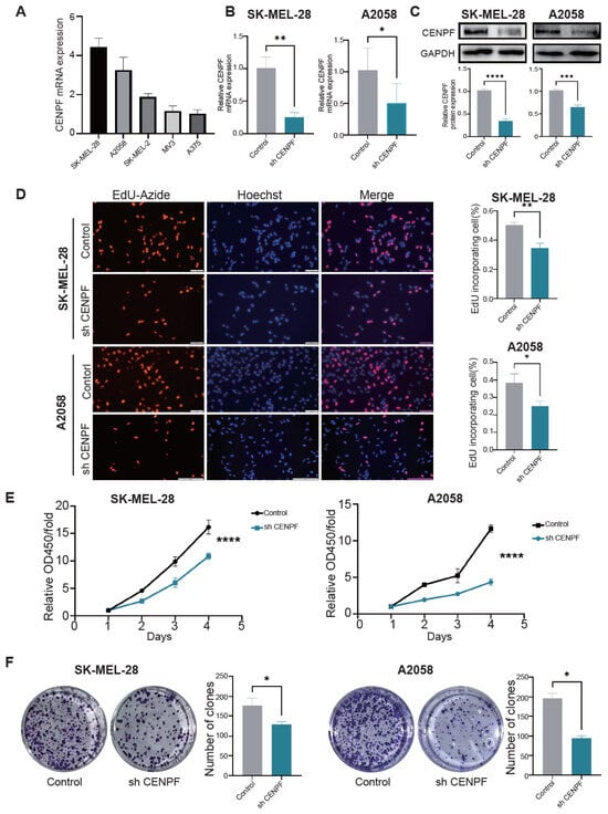 Then, we conducted cell experiments to verify the above analysis. Firstly, we detected the expression of CENPF in five melanoma cell lines (SK-MEL-28, A2058, SK-MEL-2, MV3, and A375) by qRT-PCR (Figure 4A) and chose SK-MEL-28 and A2058 cells, which had the highest expression of CENPF for further experiments. We then knocked down CENPF by shRNAs and verified the downregulation by qRT-PCR (Figure 4B) and Western blot (Figure 4C). After the downregulation of CENPF, cell proliferation was indeed decreased as assessed by EdU, CCK-8 and colony formation assays (Figure 4D–F). Moreover, although the bioinformatic analysis did not show a direct relationship between CENPF and cell metastasis, previous studies in other cancers indicated that downregulation of CENPF inhibited cell metastasis [,]. Therefore, we also measured the cell metastatic ability by wound healing and Transwell assays and found that downregulation of CENPF significantly inhibited cell metastasis (Supplementary Material Figure S1B,C). Taken together, these results indicated that CENPF could promote the proliferation and inhibit metastasis of melanoma cells in vitro.