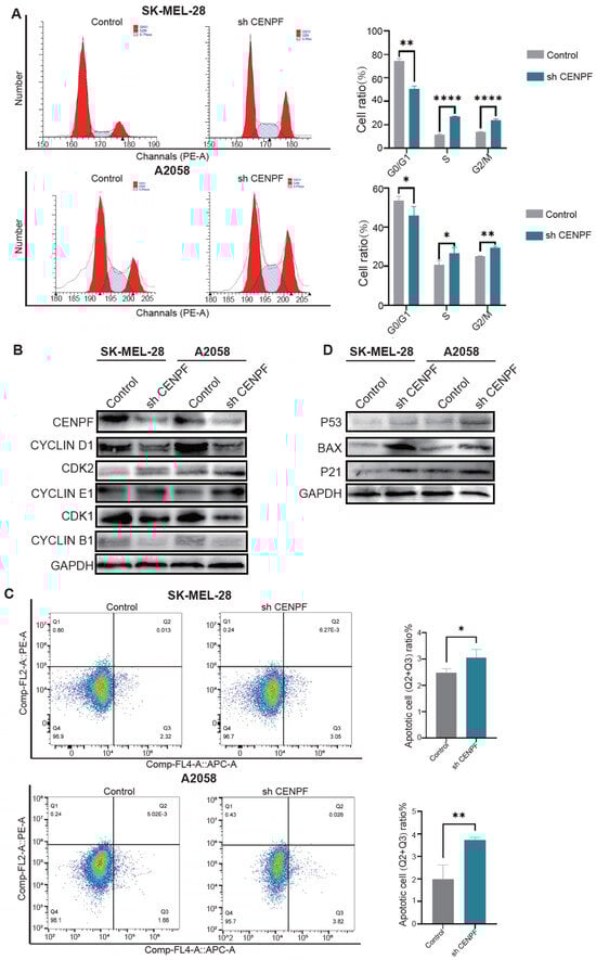 Knockdown of CENPF arrested melanoma cells in G2/M phase and increased cell apoptosis. (A) Flow cytometry analysis showing an increase in cells in the G2/M phase and S phase and a decrease in cells in the G0/G1 phase after knocking down CENPF. (B) Western blot assays confirming the decrease of G2/M markers CDK1 and cyclin B1 and G1 phase marker cyclin D1 and the increase of S phase markers CDK2 and cyclin E1 after knocking down CENPF. (C) Flow cytometry analysis showing the increase of cell apoptosis after knocking down CENPF. (D) Western blot assays confirming an increase of proteins associated with the P53 pathway after knocking down CENPF. “*” indicates p < 0.05; “**” indicates p < 0.01; “****” indicates p < 0.0001.