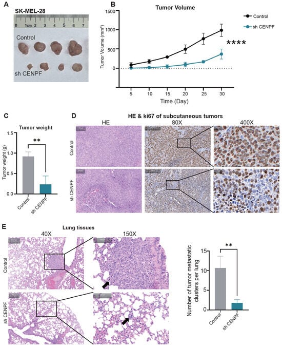 Knockdown of CENPF inhibits melanoma growth and metastasis in vivo. (A) The subcutaneous xenograft tumors were collected on day 30. (B) Subcutaneous xenograft tumor volumes were measured at the indicated time points. (C) Bar plot showing the weights of subcutaneous xenograft tumors. (D) Subcutaneous xenograft tumors were stained with H&E and IHC for Ki67. (E) Lung tissues stained with H&E; representative images are shown. “**” indicates p < 0.01; “****” indicates p < 0.0001.
