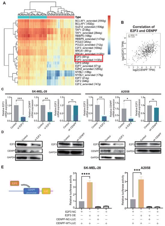 Upregulation of CENPF was regulated by E2F3 in melanoma cells. (A) SCENIC analysis prediction of the potential transcription factors of CENPF. (B) TCGA datasets prediction of a positive relationship between CENPF and E2F3. (C,D) qRT-PCR (C) and Western blot (D) assays showing the upregulation of E2F3 increased the expression of CENPF in two cell lines, but knockdown of CENPF did not influence E2F3 expression. (E) Luciferase reporter gene assay confirming that E2F3 could transcriptionally activate CENPF. “ns” indicates not significant; “*” indicates p < 0.05; “**” indicates p < 0.01; “***” indicates p < 0.001; “****” indicates p < 0.0001.