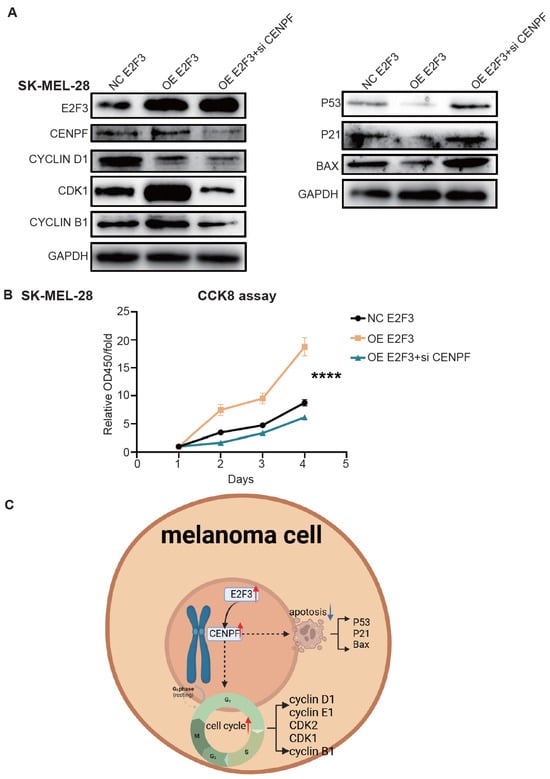 Firstly, we over-expressed E2F3 alone or both overexpressed E2F3 and knocked down CENPF in SK-MEL-28 cells. Previous studies confirmed that knockdown of E2F3 could increase G1 phase and S phase cells, while decreasing G2 phase cells []. Western blot assays confirmed that over-expressed E2F3 would decrease G1 phase proteins such as cyclin D1 and increase G2/M phase proteins such as cyclin B1 and CDK1 (Figure 8A). Both overexpressing E2F3 and knocking down CENPF reversed the cell cycle-promoting effect of E2F3 and arrested cells in G2/M phase. This was reflected by a decrease in G1 phase proteins and G2/M phase proteins, along with an increase in apoptosis proteins (Figure 8A). CCK8 assays also showed the impaired proliferative ability following CENPF knockdown (Figure 8B). In conclusion, we identified the E2F3–CENPF axis in melanoma, which contributes to melanoma’s high proliferative ability, and demonstrated that knocking down CENPF could inhibit melanoma cell proliferation and induce cell apoptosis (Figure 8C).
