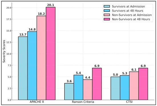p < 0.001), reflecting the progression of disease and organ failure. The CTSI, which accounts for morphological changes in the pancreas and peripancreatic tissues, demonstrated that non-survivors had consistently higher scores (6.1 vs. 5.0 at admission; 6.9 vs. 5.3 at 48 h), as presented in