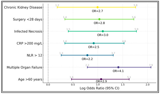 p = 0.003), echoing previous findings that early necrosectomy is often required by patients who are already severely deteriorated. Chronic kidney disease also significantly raises the likelihood of mortality (OR = 2.7,