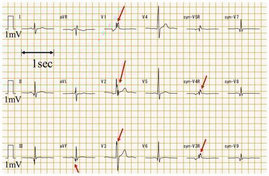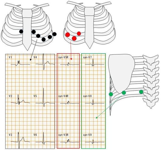 A standard 12-lead electrocardiography (ECG) cannot record the posterior wall and right ventricular side; nonetheless, an 18-lead ECG can record the posterior wall and right ventricular side. In this study, DMD was recorded in multiple directions using the chest leads of a synthesized 18-ECG (syn18-ECG) that computationally synthesized waveforms from a standard 12-lead ECG [], and the number and sites of fQRS leads and their changes with cardiac dysfunction and aging were also recorded.