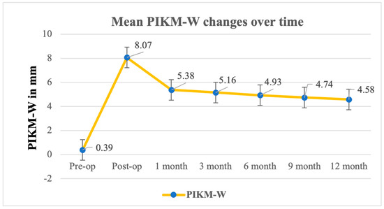 The primary outcome was the change in the PIKM-W between several key timepoints: baseline; immediately after surgery (postoperatively); and at the 1- 3-, 6-, 9-, and 12-month follow-ups (Figure 2). The mean PIKM-W changed from 0.39 mm ± 0.40 mm at baseline to 4.93 mm ± 0.98 mm at the 6-month follow-up and to 4.58 mm ± 1.28 mm at the 12-month follow-up (Table 1). The repeated-measures ANOVA results showed that the differences in the PIKM-W measured were statistically significant (F (6, 66) = 96.86, p < 0.0001). The repeated-measures ANOVA indicated a significant change in PIKM-W over time (F (6, 66) = 96.86, p < 0.0001), with a very large effect size (η2p = 0.90, 95% CI: [0.76, 0.94]). The difference between the 6- and 12-month follow-ups was evaluated separately, and no statistically significant difference could be observed between the two mean values (Table 2) (p = 0.0644).