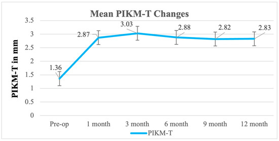 The mean PIKM-T values were 1.36 mm ± 0.43 mm, 2.88 mm ± 0.80 mm, and 2.93 mm ± 0.65 mm at baseline, 6-month follow-up, and 12-month follow-up, respectively (Figure 3). Similarly to the PIKM-W values, the PIKM-T also showed a statistically significant difference between the timepoints (F (5, 54) = 12.83, p < 0.0001). Similarly, PIKM-T showed a significant change over time (F (5, 54) = 12.83, p < 0.0001), corresponding to a large effect size (η2p = 0.44, 95% CI: [0.34, 0.54]). However, the 6- and 12-month follow-up PIKM-T values were found to be statistically non-significant (p = 0.8439) (Table 3).