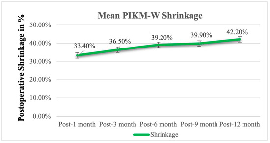 The postoperative shrinkage of the PIKM-W of the graft was evaluated and is shown in Figure 4. At the 3-month follow-up, the graft decreased in width by 36.5% ± 14.3%, and by the 6-month follow-up, shrinkage increased to 39.2% ± 14.1%, which continued to increase to 42.2% ± 16.8% by the 12-month follow-up (Table 4).