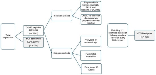 A retrospective cohort study was performed at an academic tertiary hospital in the Northeast region of the United States. Our study received approval from our hospital’s institutional review board (IRB #23X-086-2) and met all ethical standards by the Declaration of Helsinki. Medical records were obtained from the electronic medical record system (EMR). The inclusion criteria included the following: (a) singleton pregnancy; (b) birth occurring at our institution between 28 April 2020 and 31 December 2022; and (c) maternal COVID-19 infection diagnosed via PCR. Exclusion criteria included <12 years of maternal age, major fetal anomalies, and fetal loss <15 weeks. All patients in the study had a first or second-trimester ultrasound used to establish or confirm their estimated due date. A total of 140 COVID-19-positive patients were delivered to the home institution within the time frame and met all inclusion and exclusion criteria. A total of 2642 pregnant patients were delivered to the home institution between February 2020 and August 2022. In total, 136 COVID-negative patients were matched in a 1:1 ratio from the institution’s 2642 deliveries during the time frame by stratifying by date and selecting every twentieth patient for inclusion in the analysis. Thus, our final cohorts were split between 136 patients in the COVID-negative group and 140 in the COVID-19-infected group as shown in Figure 1.