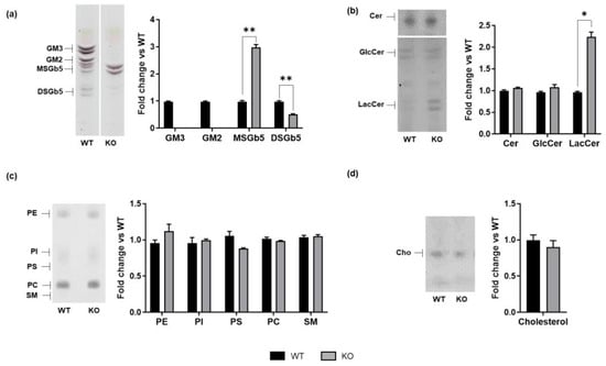 Lipid composition in WT and ST3GAL5 KO cells. An endogenous lipid pattern was obtained by extraction with chloroform/methanol/water, 20:10:1 (v/v/v), and a two-phase partitioning of total cell lysates from WT and ST3GAL5 KO cells. (a) The levels of sialylated glycosphingolipids were inferred by treating samples with Vibrio cholerae sialidase and visualized by Ehrlich reagent (for details, see Supplementary Figure S1), (b) neutral sphingolipids and ceramide were visualized by anisaldehyde reagent, (c) phospholipids and sphingomyelin were visualized by phosphorus reagent, and (d) cholesterol was visualized by anisaldehyde reagent. Lipids were identified by co-migration with specific lipid standards. The HPTLC images shown are representative of five independent experiments (n = 5) and have been equally adjusted for brightness and contrast. Data are displayed as fold changes with respect to WT cells (set to 1.0) and are presented as the mean ± SEM (* p < 0.05, ** p < 0.01 by Mann–Whitney test, WT vs. KO). SM: sphingomyelin; Cer: ceramide; Cho: cholesterol.