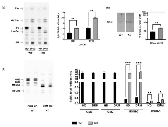 DRM lipid composition in WT and ST3GAL5 KO cells. Cell sphingolipids were metabolically labelled by [1-3H]sphingosine. Following cell lysis with 1% TX-100 at 4 °C, the HD and lipid rafts (DRMs) were isolated by ultracentrifugation on a discontinuous sucrose gradient. Extracted lipids, obtained from the organic phase and aqueous phase, corresponding to equal radioactivity amounts, were separated using HPTLC, visualized using digital autoradiography, and measured by M3 software (1.0.8.1187; Biospace Lab Inc; https://biospacelab.com/, accessed on 1 July 2019). (a) LacCer and (b) ganglioside (GM3 and GM2) and globoside (MSGb5 and DSGb5) levels were obtained by quantifying the specific lipid bands and normalizing them over the total radioactivity of the lipid species in the lane. (c) Cholesterol levels were visualized by means of anisaldehyde reagent and expressed as percentages of total cholesterol (HD + DRM). The HPTLC images shown are representative of five independent experiments (n = 5) and have been equally adjusted for brightness and contrast. Values are expressed as means ± SEMs (*** p < 0.001, ** p < 0.01, * p < 0.05 by Mann–Whitney test, WT vs. KO). Cho: cholesterol.
