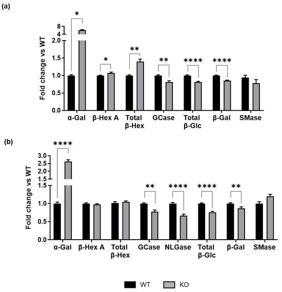 As shown in Figure 4a, we observed altered activity in several of the tested enzymes. In ST3GAL5 KO cells compared to WT cells, α-Gal and β-Hex were found to be hyperactivated, with α-Gal displaying an over 6-fold increase in activity. On the contrary, GCase and total β-Glc, as well as β-Gal, were hypoactivated. Specifically, among glucosidases, GCase activity was roughly 30% lower in ST3GAL5 KO cells than in WT cells. No alteration was detected in SMase activity. These findings demonstrate that defects in GM3 ganglioside synthesis impact the activity of enzymes involved in glycosphingolipid catabolism. Among them, the unexpected increase in α-Gal activity may further contribute to LacCer accumulation.
