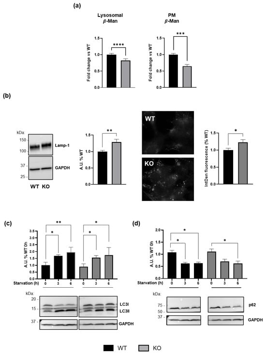Consequences of GM3SD for lysosomal homeostasis. (a) Enzymatic activity of lysosomal and PM-associated β-Man hydrolase in WT and ST3GAL5 KO cells. (b) Lamp-1 protein levels were evaluated by Western blot (WB) analysis (left) and immunofluorescence (right, 100× magnification) in WT and ST3GAL5 KO cells. WB analysis of (c) LC3 and (d) p62 proteins in cells subjected to amino acid starvation in WT and ST3GAL5 KO cells. WB data were obtained by normalizing the signal intensity of LC3-II and p62 to that of GAPDH, used as a loading control; immunofluorescence results are expressed as the integrated density (IntDen, mean fluorescence x area measured of each cell; corrected for the background). Images shown are representative of five independent experiments and have been equally adjusted for brightness and contrast. Histograms depict the means ± SEMs of values obtained from five independent experiments (n = 5) and expressed as percentages with respect to WT controls (set to 1.0; A.U.: arbitrary units). Data were compared by Mann–Whitney tests ((a,b) **** p < 0.0001, *** p < 0.001, ** p < 0.01, * p < 0.05, WT vs. KO) and one-way ANOVA followed by Tukey’s post hoc test ((c,d) ** p < 0.01, * p < 0.05 vs. WT before starvation, 0 h).