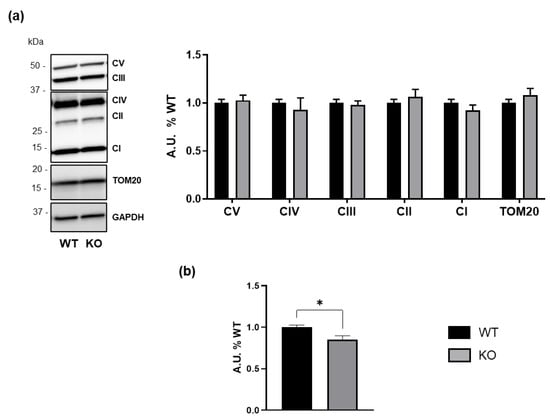 Considering the altered mitochondrial function observed in samples from patients with GM3SD [12], we decided to investigate whether this phenotype could be replicated in our experimental model. Consistent with data obtained from analyses on murine St3gal5-null brains, mitochondrial protein levels were unaffected by GM3SD, suggesting no change in mitochondrial mass (Figure 6a).