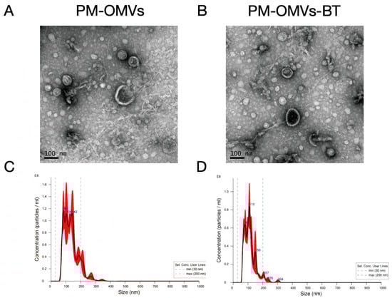 Characterization of engineered PM-OMVs-BT: (A) TEM image of PM-OMVs. Scale bar = 100 nm. (B) TEM image of PM-OMVs-BT. Scale bar = 100 nm. (C) NTA results of PM-OMVs. (D) NTA results of PM-OMVs-BT.