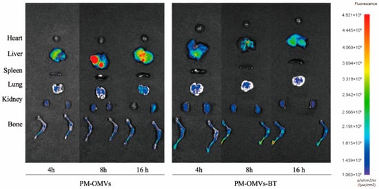 Distribution of PM-OMVs-BT in vivo. Distribution of Cy5-labeled PM-OMVs and PM-OMVs-BT in vivo at 4 h, 8 h, and 16 h after injection.