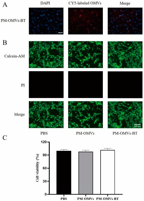 The uptake and cytotoxicity of PM-OMVs and PM-OMVs-BT in vitro: (A) Uptake of Cy5-labeled PM-OMVs and PM-OMVs-BT detected by confocal laser scanning microscopy. (B) D/L staining after treatment with PBS, PM-OMVs, and PM-OMVs-BT. Scale bar = 100 μm. (C) The cytotoxicity of PM-OMVs and PM-OMVs-BT in vitro.