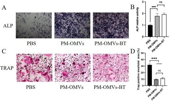 PM-OMVs-BT promote osteogenesis in vitro: (A) ALP staining of cells after treatment with PBS, PM-OMVs, and PM-OMVs-BT. Scale bar = 200 μm. (B) Quantitative analysis of ALP staining. (C) TRAP staining of cells after treatment with PBS, PM-OMVs, and PM-OMVs-BT. Scale bar = 200 μm. (D) Quantitative analysis of TRAP staining. *** p < 0.001. ns = not significant.