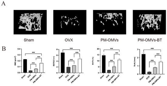 This discovery not only provides a new avenue for the treatment of OP but also significantly enriches the research on the gut–bone axis based on microbial OMVs. The gut–bone axis is an emerging field that explores the interactions between the gut microbiota and bone health. OMVs, which are nanoscale vesicles released by bacteria, have garnered increasing attention due to their ability to deliver bioactive molecules and modulate host cellular responses. By engineering PM-OMVs-BT to target bone tissue, we have expanded the application scope of microbial OMVs in skeletal health and disease.