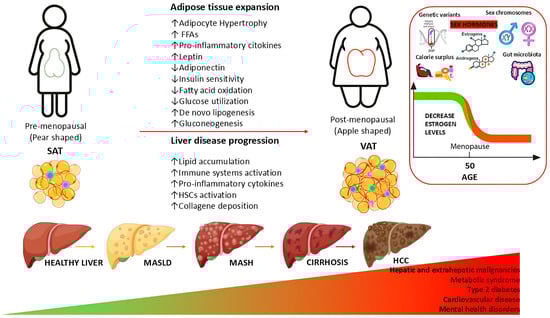 MASLD development and progression after menopause: the interplay between hormonal changes, weight gain, metabolic dysfunction, genetics, and mental health disorders. SAT: subcutaneous adipose tissue; FFAs: free fatty acids; VAT: visceral adipose tissue; HSCs: hepatic stellate cells; MASLD: metabolic dysfunction-associated steatotic liver disease; MASH: metabolic dysfunction-associated steatohepatitis; HCC: hepatocellular carcinoma.