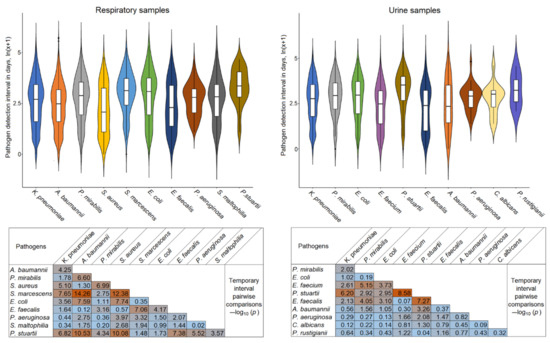 Temporal patterns of the top 10 respiratory and urinary pathogens over the 30-day period. The order of species is from largest to smallest, based on abundance. Violin plots for temporal distributions of microorganisms and heatmap matrices for p-values comparing these distributions are shown for respiratory (left) and urinary pathogens (right). The same species in the respiratory and urinary tracts are colored the same. Ten intervals within a 3-day window (0–29 days) are plotted on the Y-axis in ln(x + 1) format. All p-values < 0.05, and <0.022 (represented in the heat map matrix as (−log10) > 1.3 and > 1.66 for respiratory and urinary pathogens, respectively) are significant after FDR correction. The original data for the entire hospitalization period are presented in Table S2.