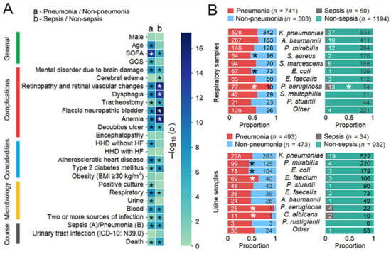 The results of the case-control studies comparing pneumonia (n = 879) vs. non-pneumonia (n = 735) and sepsis (n = 54) vs. non-sepsis patients (n = 1560) by clinical characteristics are shown in Figure 3A and Tables S3 and S4. A large number of clinical characteristics associated with poorer health were also associated with the development of both pneumonia and sepsis. Patients with pneumonia were older and had worse SOFA and GCS scores than those without pneumonia. The majority of primary disease complications, several comorbidities, positive microbiological cultures, two or more colonization sites per person, sepsis, and death were more common in patients with pneumonia than in those without pneumonia. Sepsis was diagnosed in 54 patients, of whom 46 (85%) were diagnosed with pneumonia. The sepsis group was strongly enriched with patients with severe complications of the primary disease, which are not fully captured by severity scoring systems but worsen a patient’s condition, increasing the possibility of infection and weakening the ability to fight infection.
