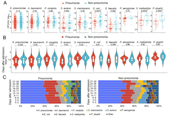 The titer and dynamics of pathogens in the presence or absence of disease are illustrated using respiratory samples from pneumonia/non-pneumonia patients (Figure 4). The titer of pathogens in respiratory samples from patients with pneumonia was the same or even lower (E. coli, S. maltophilia, and P. stuartii) than that in patients without pneumonia (Figure 4A). The dynamics of the pathogens did not differ between the patient groups (Figure 4B). The violin plots for the temporal patterns generally show similar density peaks (a higher number of pathogen isolates) and troughs in each pathogen distribution over the study period in both patient groups. Some differences can be observed in the P. aeruginosa violin plot, with the opposite directionality of the peaks. Patients with pneumonia had a delayed peak compared to patients without pneumonia, who had an early peak followed by a gradual decline. This reflects the potential differences in P. aeruginosa colonization and infection rates between the groups. Figure 4C shows that the patterns of pathogen dynamics were largely similar in the compared patient groups; however, in the group without pneumonia, the relatively small contribution of P. aeruginosa to the microbial community tended to become infinitesimal over time.