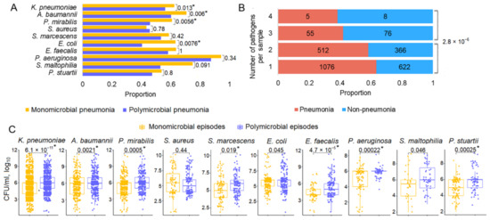 Monomicrobial and polymicrobial respiratory tract cultures. (A) The proportion of patients with pneumonia among the top 10 respiratory pathogens. (B) The proportion of patients with pneumonia in relation to the number of pathogens detected. (C) Pathogen titer in monomicrobial episodes compared with that in polymicrobial episodes. For polymicrobial cultures, combinations of the pathogen of interest with all the other pathogens were considered. (A,C) Significant p-values after FDR correction are marked with a *. Abbreviations: CFU, colony-forming units.