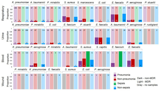 Figure 1 shows the top 10 pathogens, where available, for the main culture sites. Only the first isolate of a species from each patient was included in the analysis; duplicates (i.e., the same microorganisms found in consecutive samples) were excluded. The most commonly identified microorganism in the microbial communities was Klebsiella pneumoniae (range, 31–39%), depending on the site of culture. Acinetobacter baumannii was more common in respiratory samples (17%) and less common in the blood (9%) and urine (4%). Proteus mirabilis was common in all types of biomaterials. It is known to cause a variety of human infections (eyes, wounds, and gastrointestinal tract) but is most specific for catheter-associated urinary tract infections [51]. P. mirabilis is rarely considered a respiratory pathogen [52], so its high prevalence in respiratory samples (11%) was unexpected. In general, a relatively limited spectrum of the same microorganisms was found among the most common pathogens in all culture sites considered.