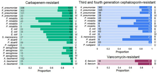 Critical and high-priority pathogens. Light bars correspond to pathogens that are resistant to the antibiotics of the last resort, while darker bars correspond to pathogens that are sensitive or of intermediate sensitivity to these categories of antibiotics. Abbreviations: R, respiratory; U, urine; B, blood; W, wound.