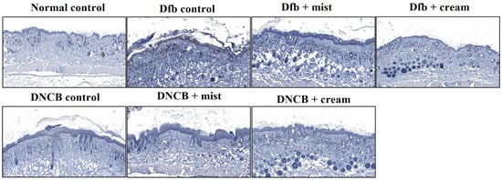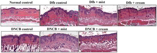 Effect of DSMs on the histological structure of Dfb- or DNCB-induced AD-like skin lesions in NC/Nga mice. The dorsal skin of untreated mice, Dfb-treated mice, DNCB-treated mice, Dfb plus mist formulation DSM-treated mice, Dfb plus cream formulation DSM-treated mice, DNCB plus mist formulation DSM-treated mice, and DNCB plus cream formulation DSM-treated mice was collected on day 14. Skin sections were stained with H&E for histological evaluation. Original magnification, ×400. Mist, DSM mist; Cream, DSM cream.