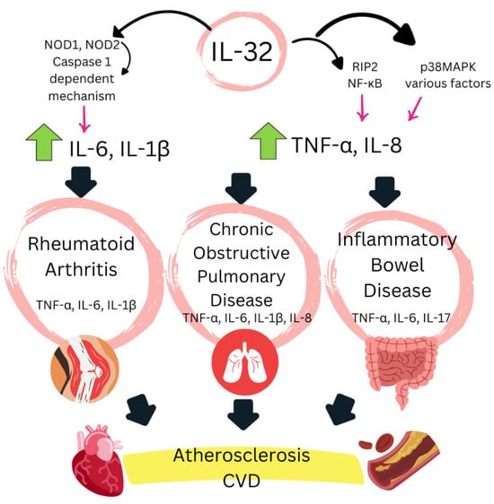 Although specific data on the utility of IL-32 levels as a biomarker for CV risk assessment in RA patients are currently lacking, genetic findings suggest its potential involvement. Notably, the influence of a functional SNP in the IL-32 gene (rs4786370) has been investigated, revealing that RA patients carrying this variant have higher circulating HDL concentrations, potentially indicating a protective effect against CVD []. Furthermore, in patients with non-alcoholic fatty liver disease and metabolic dysfunction, IL-32 levels have been associated with poor blood pressure control, the primary CV risk factor []. However, its association with CV risk extends beyond RA. Elevated IL-32 levels have also been observed in other chronic inflammatory conditions, such as metabolic disorders and HIV infection, which indicates that this cytokine may not be exclusive to RA. For instance, in patients with HIV, increased IL-32 levels have been associated with subclinical markers of atherosclerosis [,,]. Additionally, IL-32 has been implicated in other chronic diseases with increased CV risk, such as chronic obstructive pulmonary disease (COPD) and inflammatory bowel disease (34), reinforcing its broader role in systemic inflammation. Nevertheless, its overexpression in synovial tissue—particularly the IL-32γ isoform—suggests a distinct disease-specific dimension in RA. IL-32’s interplay with TNF-α and other inflammatory mediators is known to drive synovial inflammation and endothelial dysfunction, both of which could further heighten CV risk in this patient population. Future studies should focus on longitudinal evaluations that compare IL-32 levels in RA with those in other inflammatory disorders to determine whether its predictive value is indeed specific to RA-related CV complications or reflects a more generalized inflammatory state.