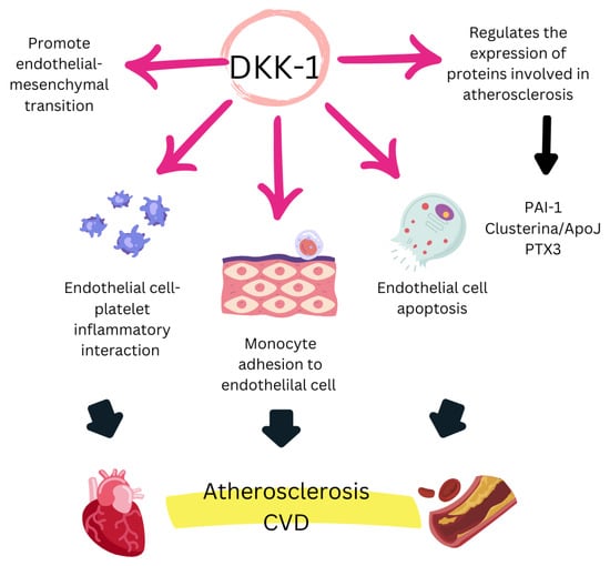 DKK-1 plays a crucial role in atherosclerosis and various CVD. Previous studies have documented elevated DKK-1 levels in patients with arteriosclerosis, coronary artery disease (CAD), or carotid plaques []. In this regard, high DKK-1 levels have been associated with coronary calcifications and independently predict the presence of atherosclerotic plaques []. Moreover, plasma DKK-1 levels have been found to be significantly higher in patients with acute stroke compared to those with stable cerebrovascular disease, and both groups show higher levels than healthy individuals []. Further research has confirmed that DKK-1 levels act as an independent marker of stroke []. In the context of premature AMI, studies from 2012 linked this event to elevated DKK-1 levels, suggesting that reduced Wnt signaling may be a contributing factor []. Additionally, in diseases with a high CV risk, such as T2DM, elevated DKK-1 levels have been observed compared to healthy controls, correlating with endothelial dysfunction and platelet activation []. Conversely, diabetic patients with lower baseline DKK-1 levels exhibited better cardiometabolic parameters at baseline [].