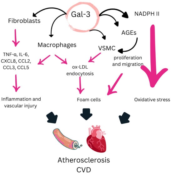 A diagram showing the mechanisms by which Gal-3 promotes the formation of atherosclerosis. Adapted from [,]. Gal-3: galectin-3; TNF-α: tumor necrosis factor-α; IL-6: interleukin-6; CXCL8: CXC motif chemokine 8; CCL2: CC chemokine ligand 2; CCL3: CC chemokine ligand 3; CCL5: CC chemokine ligand 5; ox-LDL: oxidized low-density lipoprotein; VSMC: vascular smooth muscle cells; AGEs: advanced glycation end products; NADPH II: nicotinamide-adenine dinucleotide phosphate II.