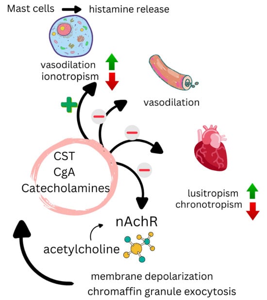 A diagram showing the functions of the CST and several of its receptors. The inhibition of nAchR interferes with membrane depolarization, which subsequently prevents the entry of the calcium necessary for the exocytosis of chromaffin granules, adapted from []. nAchR: nicotinic acetylcholine receptors; CST: catestatin; CgA: chromogranin A. Red arrow indicates decrease, green arrow indicates increase, + indicates activation, and − indicates inhibition.