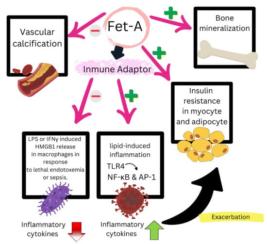 A diagram representing the role of fetuin-A. It improves the absorption and fixation of calcium and phosphate minerals. It acts as a transporter of insoluble phosphate and calcium, preventing the precipitation of calcium salts and the generation of vascular calcifications. It is a negative regulator of the innate immune response and an adaptor between FFAs and TLR4 signaling in lipid-induced inflammation, and TLR4 signaling leads to the activation of NF-κB and AP-1, adapted from [,]. HMGB1: High Mobility Group Box 1; LPS: lipopolysaccharide; IFN γ: interferon γ; FFAs: free fatty acids; TLR4: Toll-like receptor 4; NF-κB: nuclear factor kappa-light-chain-enhancer of activated B cells; AP-1: activating protein 1. + Indicates activation, − indicates inhibition, red arrow indicates decrease, and green arrow indicates increase.