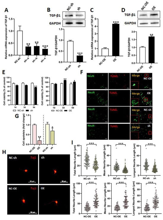 In order to investigate the biological roles of TGF-β1 in DRG neuron cells, we used lentivirus to knockdown or overexpress TGF-β1. CCK8 assay, TUNEL staining, and IF staining was employed to detect the effects of TGF-β1 on cell viability, apoptosis, and the neurite outgrowth of DRG neurons after the cells had been transfected with lentivirus. Firstly, we used RT-qPCR and Western blot to detect the expressions of TGF-β1 following transfection. The three viruses (sh-a, sh-b, and sh-c) were used to knockdown TGF-β1. The expressions of TGF-β1 were significantly reduced after transfection. However, the expression was lowest when using sh-c (Figure 2A). Therefore, this virus (sh-c) was employed in the following research. The expression of TGF-β1 was also significantly decreased after transfection with sh-c, as detected via Western blot (Figure 2B). The virus (OE) was used to overexpress TGF-β1. The expressions were markedly increased after transfection with OE (Figure 2C,D).