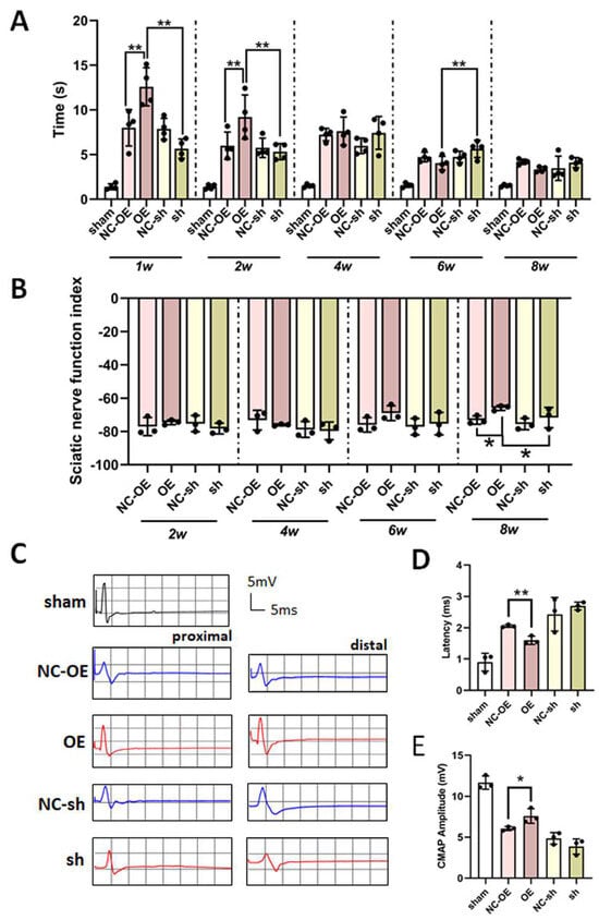 An electrophysiological test is recognized as direct evidence reflecting functional recovery []. The electrophysiological data show that latency was significantly decreased, and CMAP amplitude was obviously increased in the overexpression group compared to in the negative control group and the knockdown group (Figure 5C,D). The data also indicate that TGF-β1 overexpression improved nerve fibers, innervating the target muscle, and thereby accelerating the functional recovery.