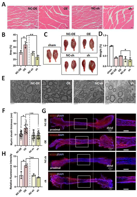 Secondly, we observed regenerated myelinated nerve fibers with transmission electron microscopy. The average thickness of the regenerated myelin sheath was distinctly amplified in the overexpression group compared to the negative control and knockdown groups (Figure 6E,F).