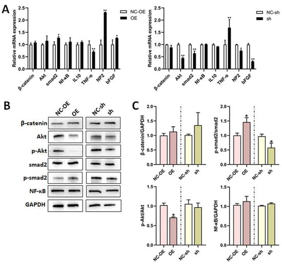 Effects of TGF-β1 on cell factors after sciatic nerve injury. After the rat model of sciatic nerve regeneration was established, the lentivirus was intrathecally injected into the L4-L5 foramina. (A) The mRNA expressions of β-catenin, Akt, smad2, Nf-κB, IL-10, TNF-α, NP2, and bFGF in the DRG after lentivirus injection were detected via RT-qPCR. (B) The expressions of β-catenin, Akt, p-Akt, smad2, p-smad2, and Nf-κB in the DRG after lentivirus injection were detected via Western blot. (C) Statistical analysis of (B). Versus NC-sh or NC-OE, * p < 0.05, and ** p < 0.01. n = 3. TGF-β1, transforming growth factor-beta 1. RT-qPCR, real-time quantitative PCR. DRG, dorsal root ganglia. shRNA, small hairpin RNA. NC-sh, shRNA lentivirus negative control. OE, overexpression. NC-OE, overexpression lentivirus negative control. Nf-κB, nuclear factor kappa-B. IL, interleukin. TNF-α, tumor necrosis factor-α. NP2, neuronal pentraxin 2. bFGF, basic fibroblast growth factor. GAPDH, glyceraldehyde-3-phosphate dehydrogenase.