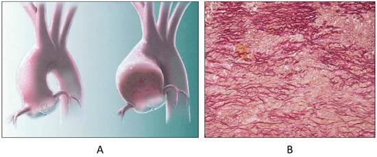 Aortopathy associated with bicuspid valve with dilatation of sinusal ascending aorta (A) and elastic lamellae disruption in the aortic tunica media (B) [18].