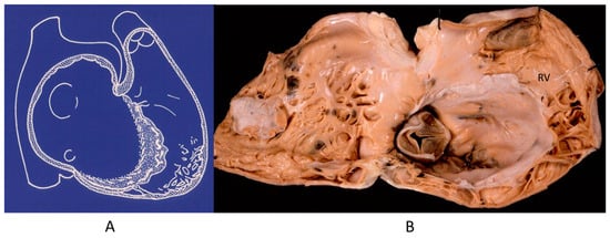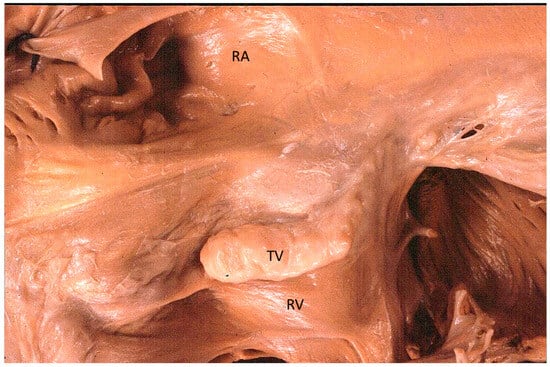 - Barbara, D.W.; Edwards, W.D.; Connolly, H.M.; Dearani, J.A. Surgical pathology of 104 tricuspid valves (2000-2005) with classic right-sided Ebstein’s malformation. Cardiovasc. Pathol. 2008, 17, 166–171. [Google Scholar] [CrossRef] [PubMed]