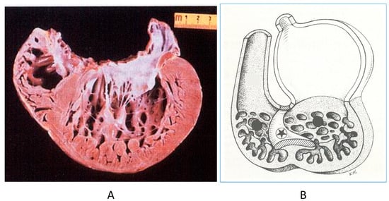 A gross view of a heart specimen with biventricular noncompaction (A) and drawing of noncompacted ventricles (B).