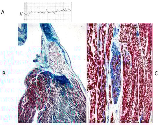 Electrocardiogram with AV block (A). At histology, bifurcation of His bundle with fibrous interruption of the left bundle branch (B) and the right bundle branch (C) were observed [15].