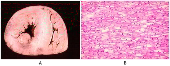 Big heart (A) by glycogenosis at histology (B) (Pompe disease) in an infant.