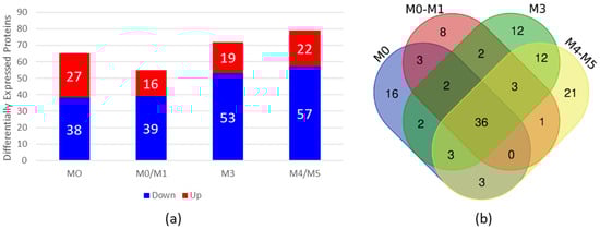 Proteomic analysis of BM plasma from AML patients compared with BM plasma from HDs. (a) Differential expression analysis via ExpressionE showing increased and decreased expression of proteins in BM plasma samples from AML patients compared with BM plasma samples from HDs. The bars in red represent the number of differentially expressed proteins whose expression was increased, and the bars in blue represent the number of differentially expressed proteins whose expression was decreased in the plasma of AML patients. (b) Venn diagram of differentially expressed proteins found in each subtype, showing overlapping and unique differentially expressed plasma proteins in each subtype. BM = bone marrow; AML = acute myeloid leukemia; HDs = healthy donors.