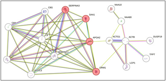 Network of predicted interactions via STRING software (Version 12.0) with the differentially expressed proteins identified in the present study. The proteins highlighted in red are related to the acute inflammatory response.