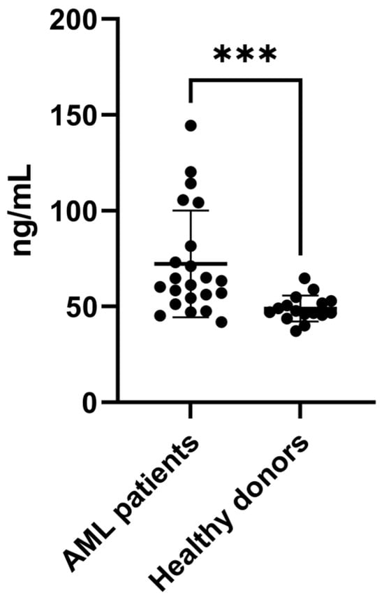 To evaluate the concentrations of human serum amyloid A (SAA1) in plasma samples from AML patients (n = 21) and from healthy donors (n = 15), an enzyme-linked immunosorbent assay (ELISA) was performed according to the corresponding manufacturer’s instructions. SAA1 levels were determined through an ELISA kit (RAB0420, Sigma–Aldrich, St. Louis, MO, USA), with a sensitivity of 500 pg/mL. The values were read at 450 nm in an ELISA reader, and SAA1 concentrations were calculated from specific calibration curves prepared with known standard solutions. Statistical analysis and graphical representations were performed using GraphPad Prism software version 9.0. (GraphPad Software, La Jolla, CA, USA).